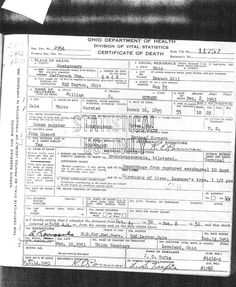 Certificate of William G. Howard (scanned image) ~ March 16, 1895 - Feb. 8, 1951 |